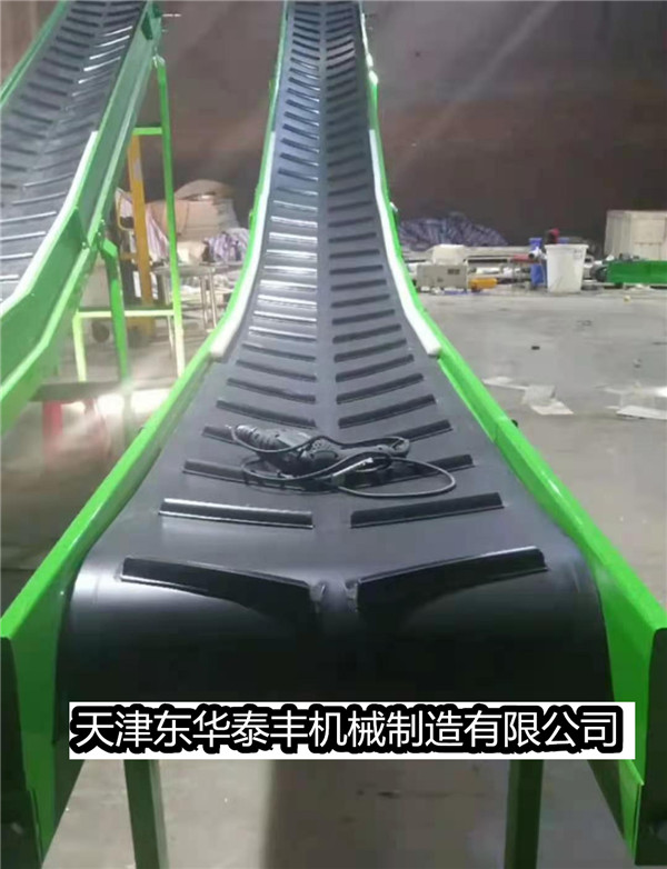 爬坡皮帶機(jī)輸送的角度較好不要超過(guò)13度,如果超過(guò)13度要在皮帶表面增加擋條或者皮帶要選擇帶有摩擦的草帶。在制作爬坡皮帶機(jī)時(shí)通常要在皮帶機(jī)兩側(cè)腰邊增加防護(hù)欄或在皮帶的側(cè)邊增加裾邊,以防止物體在輸送過(guò)程中跌落。